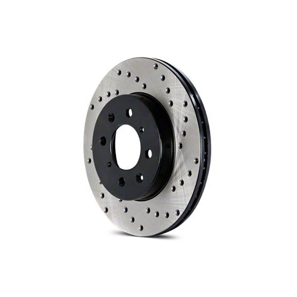 StopTech Drilled Sport Rotors are 1-piece direct replacement brake discs for factory brake systems and stock calipers that look great behind your wheels – and offer significantly improved braking performance. The unique cross-drilling aids with heat and brake dust dispersal; prevents glazing of the pads; adds bite and improves wet and dry braking performance. Built to last; the black e-coating provides protection from corrosion and the high carbon metallurgy (in most applications) offers quieter operation; better crack resistance and increased performance.
