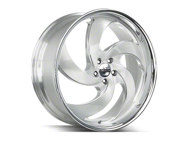 Strada Retro 5 Brushed Face Silver Milled with Stainless Steel Lip 6-Lug Wheel; 22x10; 24mm Offset offers a sleek and assertive aesthetic that enhances a vehicle's visual presence. Its gloss black finish amplifies the appeal, making it a great match for bold styling themes. This wheel brings a refined edge to any build while maintaining a confident stance on the road. Crafted to elevate the appearance of a wide range of vehicles.