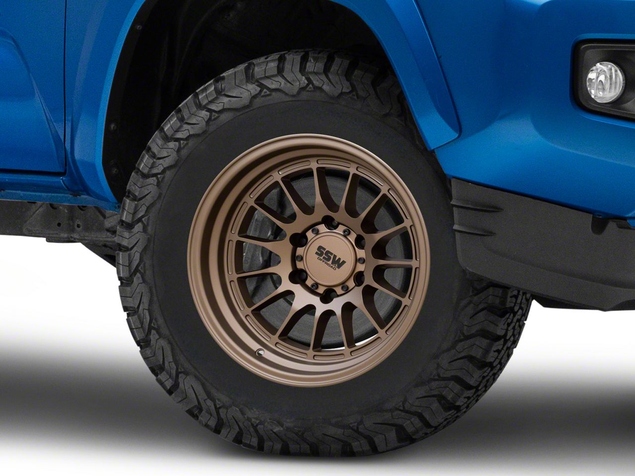 Application. This SSW Off-Road Wheels Dakar Matte Bronze 6-Lug Wheel; 17x9; -25mm Offset, with a backspace of 4.016 Inch, 102.1mm and bolt pattern of 6 x 139.7mm (6 x 5.5-Inch), ensures optimal alignment and driving stability. It is designed to fit 2016-2023 Tacoma models. Sold individually.