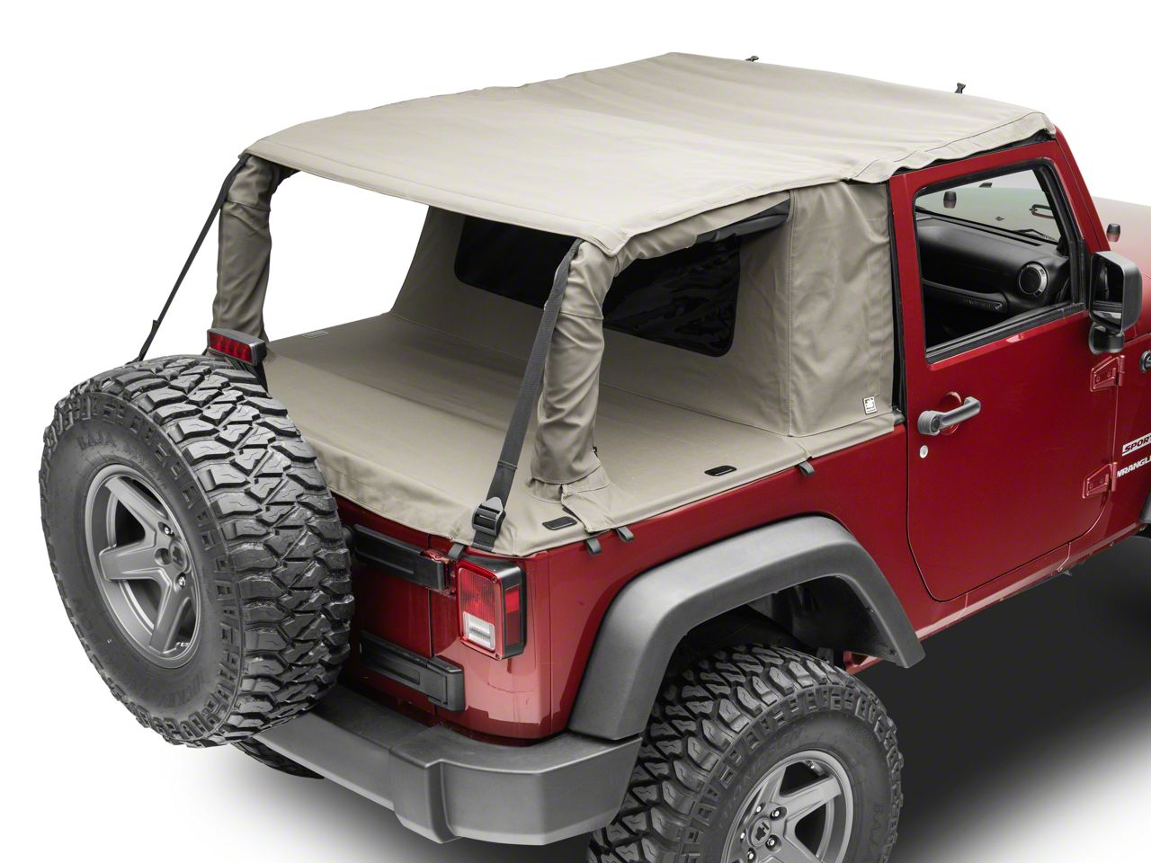 Application. This military green Suntop Bowless Top with Rear Cargo Cover is specifically designed to fit 2007-2018 Jeep Wrangler 2-Door JK models. The Top and Rear Cargo Cover are available separately or as a complete Kit - please select from the options listed.