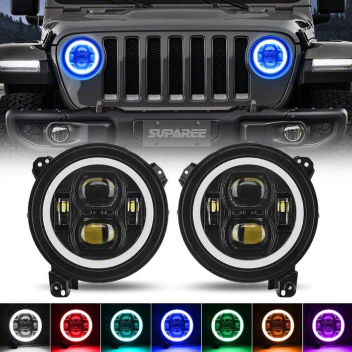 Bluetooth App Integration. Stand out day or night with the Suparee 9-Inch LED Headlights' multicolor RGBW halo rings, fully programmable through a user-friendly Bluetooth smartphone app. Cycle through countless color combinations, set pulsing rhythms to your favorite tunes, or activate strobing and fading effects for car meets and off-road gatherings.