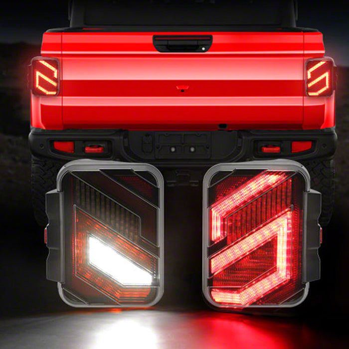 Construction and Appearance. Constructed from high-quality ABS housing and PMMA lenses, these tail lights are built to withstand harsh conditions. The black housing combined with smoked lenses offers a sleek, aggressive look that complements the Gladiator's rugged design. The full LED setup ensures brighter illumination compared to traditional halogen lights.