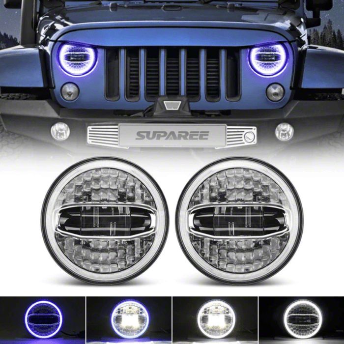 Modernized Lighting Upgrade. The Suparee 7-Inch LED Headlights with White DRL and Blue Halo offer a stylish and functional lighting enhancement for Jeep CJ7 and Wrangler TJ/JK models. These headlights provide up to 20% brighter light output compared to factory units, with built-in white DRL and a striking blue halo for increased visibility and visual appeal. With integrated Canbus support and plug-and-play design, they're perfect for hassle-free upgrades.