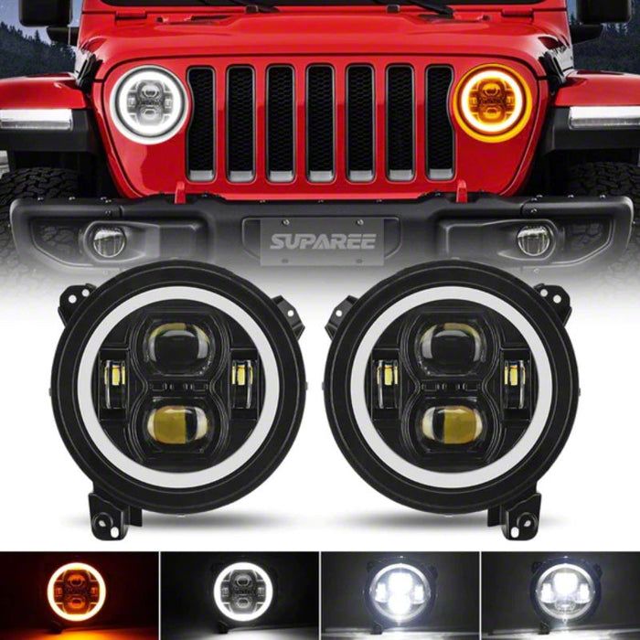 Application. These Suparee 9-Inch LED Headlights with White DRL and Amber Turn Signals fit 2018-2026 Jeep Wrangler JL Models.