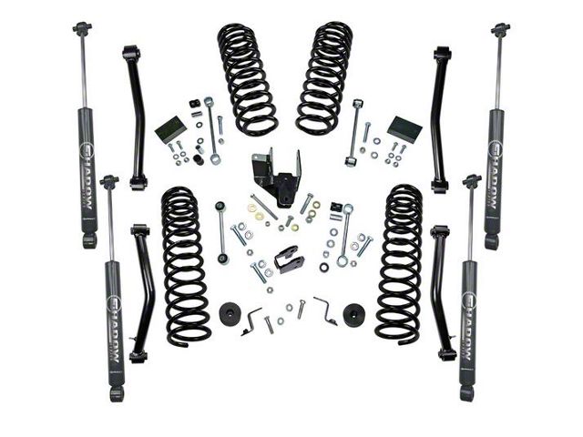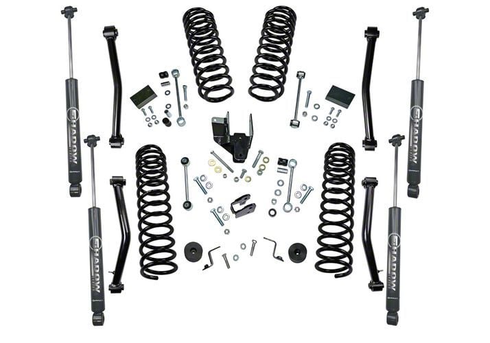 Improved Stance, Balance, and Handling. Boost your Jeep Wrangler’s all-terrain performance to tackle the challenging terrains with ease and confidence. Install the SuperLift 4-Inch Dual Rate Coil Spring Suspension Lift Kit with Shadow Series Shocks to experience more adventurous drives. This kit utilizes dual-rate coil springs, Shadow Series Shocks, lower link arms, sway bar links, track bar bracket, and compression stop spacers for a bolder off-road stance and improved driveability.