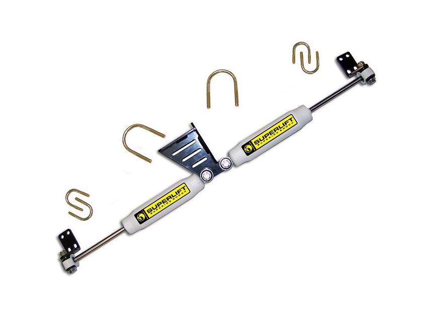 Not a Substitute but a Stabilizer. Maintain the freedom of your off-road performance with the SuperLift Superide High Clearance Dual Steering Stabilizer Kit for 1.5+ inch Lift. This dual steering stabilizer is compatible with up to a 1.5-inch height lift for necessary clearance and improved control and vibration restraint. Resists sudden driving shock, the Dual Steering Stabilizer replaces and relocates your stock steering stabilizer while guarding against problems that may arise from gradual wear and tear on your suspension.