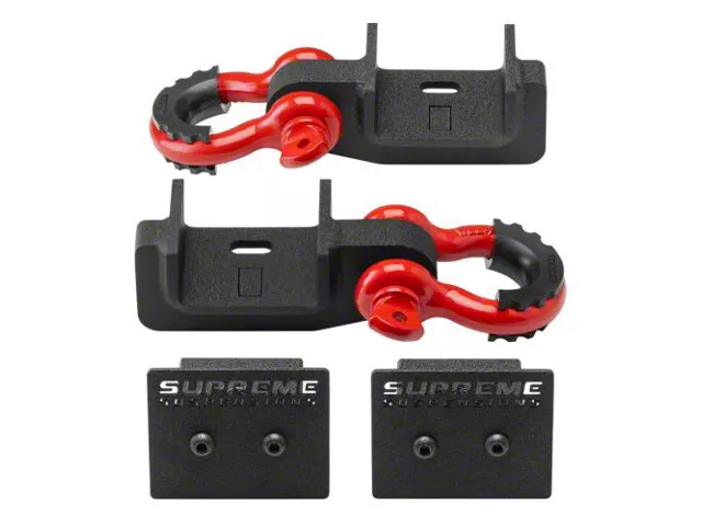 High Grade Quality. Constructed from premium materials and designed to meet rigorous quality standards, Supreme Suspensions Bolt-On Shackle Mount ensures a long lasting durability. Best of all, it comes with red d-ring shackles that will give your vehicle an extra layer of stylish flair while you show off its beefed up power.