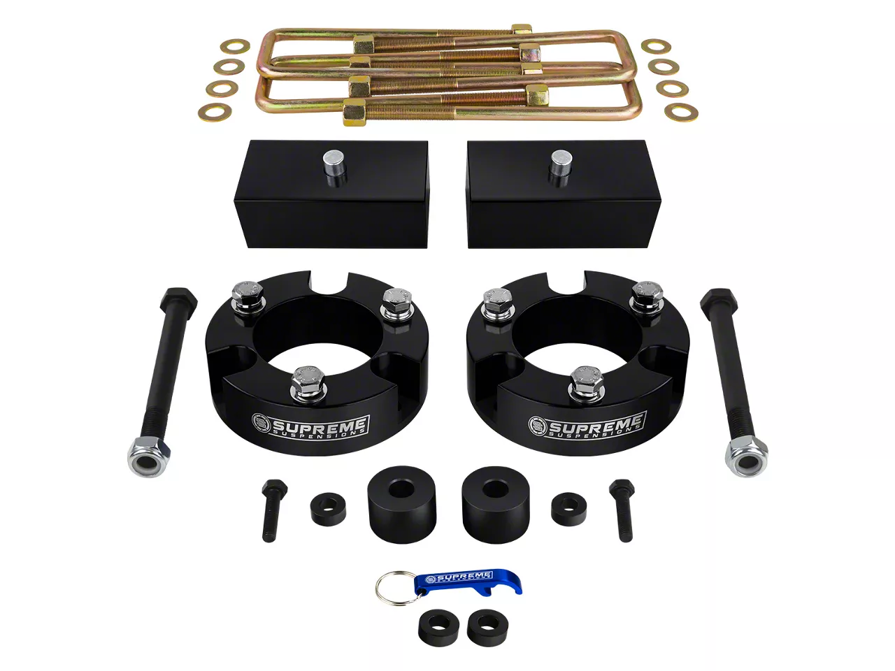 Precision-Crafted Spacers & Blocks. The Supreme Suspensions 3-Inch Front & 1-Inch Rear Pro Billet Lift Kit provides its lift via spacers CNC-machined from solid billets of 6061-T6 aircraft aluminum. This construction method produces lift spacers and blocks that are extremely strong, lightweight, and free of any welded seams that may potentially become failure points in the future. Additionally, the front lift spacers and rear lift blocks are then hard anodized in black, for a finish that’s way tougher than powder coating.