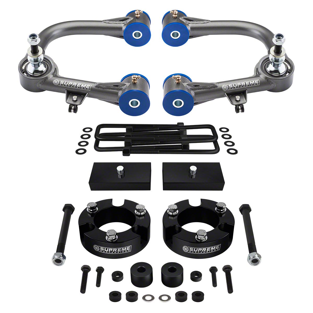 3.5 Inch Front / 1 Inch Rear. Increase your lift height 3.50 inches on the front and 1 inch to the rear while maintaining your OEM factory ride with the high-performance Supreme Suspensions 3.5-inch Front / 1-inch Rear Pro Billet Lift Kit. Part of the Pro Billet series, these strut spacers offers ground clearance to help accommodate those larger wheels. This unit is sold as a kit.