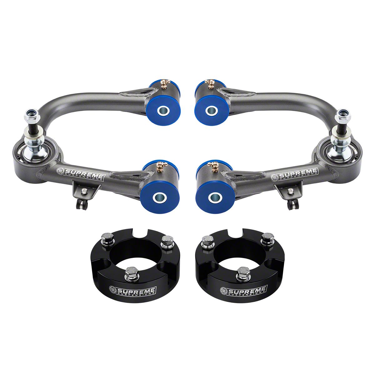 Meticulous Design. Power up your ride and experience the thrill of Supreme Suspensions’ 3.50-Inch Pro Billet Front Strut Spacer Leveling Kit. This kit is equipped with injection molded polymer front lift spacers and CNC-machined billet aluminum rear lift block components, which all elevate both the front and rear ends of your vehicle, producing a dramatic effect that won't be ignored.
