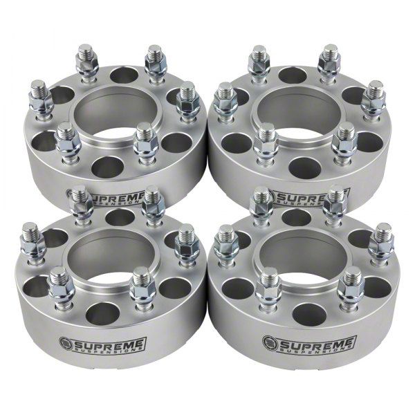 Looks and Handling. Enhance your vehicle's performance and style with our Supreme Suspensions 2-Inch Pro Billet Hub Centric Wheel Spacers in Silver (Set of Four). Designed for both front and rear placement, these wheel spacers provide a 2-inch thickness and feature a stud size of M12 x 1.25, ensuring a perfect fit for your vehicle. They also allow your ride to accept wider custom rims and tires quickly and easily These spacers not only widen your tire track and improve stability and handling, but they also give your vehicle a sleek and aggressive appearance.