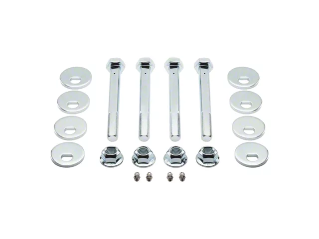 Construction and Appearance. Manufactured with precision CNC-cut cams and strong 12.9 zinc-coated hardware, this bolt kit is designed to last. The greaseable composition allows for easy maintenance, while the silver corrosion-resistant finish ensures durability and a clean look under the chassis.