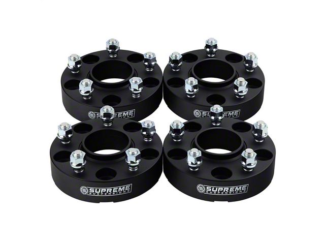 Function and Aesthetics. Widen your Jeep’s tire track for a more rugged and aggressive look with the Supreme Suspensions 2-Inch Pro Billet Wheel Spacers in Black (Set of Four). This wheel spacer kit has heavy-duty low-profile acorn nuts to seat and centers the spacer to your original studs. These spacers are compatible even with custom wheels and tires for more modern styling and a stronger stance on and off the road.