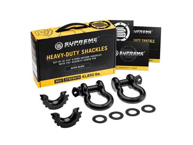 Application. With a universal fitment this Supreme Suspensions 3/4-Inch D-Ring Shackle Kit; Black will mount to any vehicle equipped with standard 3/4-inch D-Ring mounts. Sold as a set of (2) D-Rings.