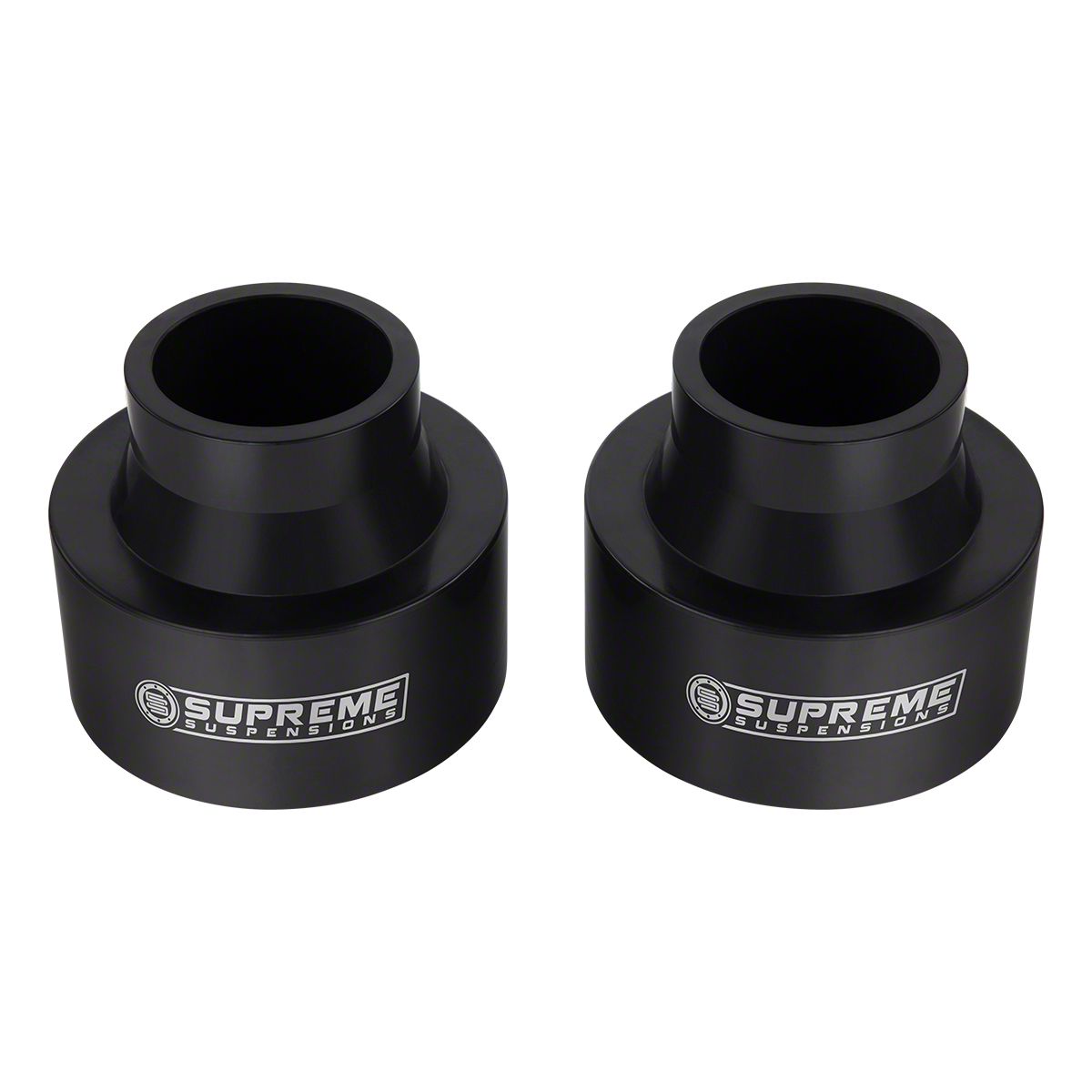 Installation. The Supreme Suspensions 3-Inch Pro Front Spring Spacer Leveling Kit Involves placing spacers above the existing coil springs to lift the vehicle. Bolting is required to secure spacers, no drilling is needed.