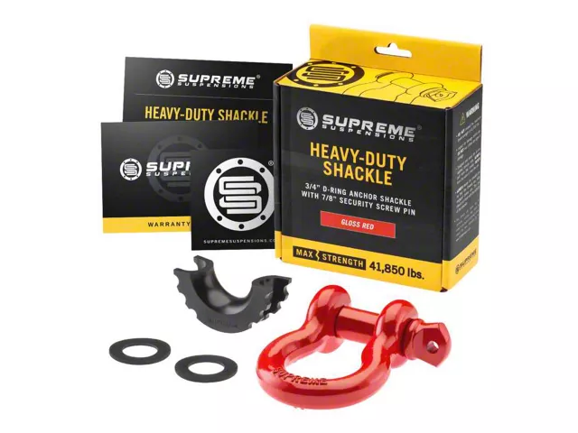 Application. With a universal fitment this Supreme Suspensions 3/4-Inch D-Ring Shackle; Red will mount to any vehicle equipped with standard 3/4-inch D-Ring mount. Sold individually.