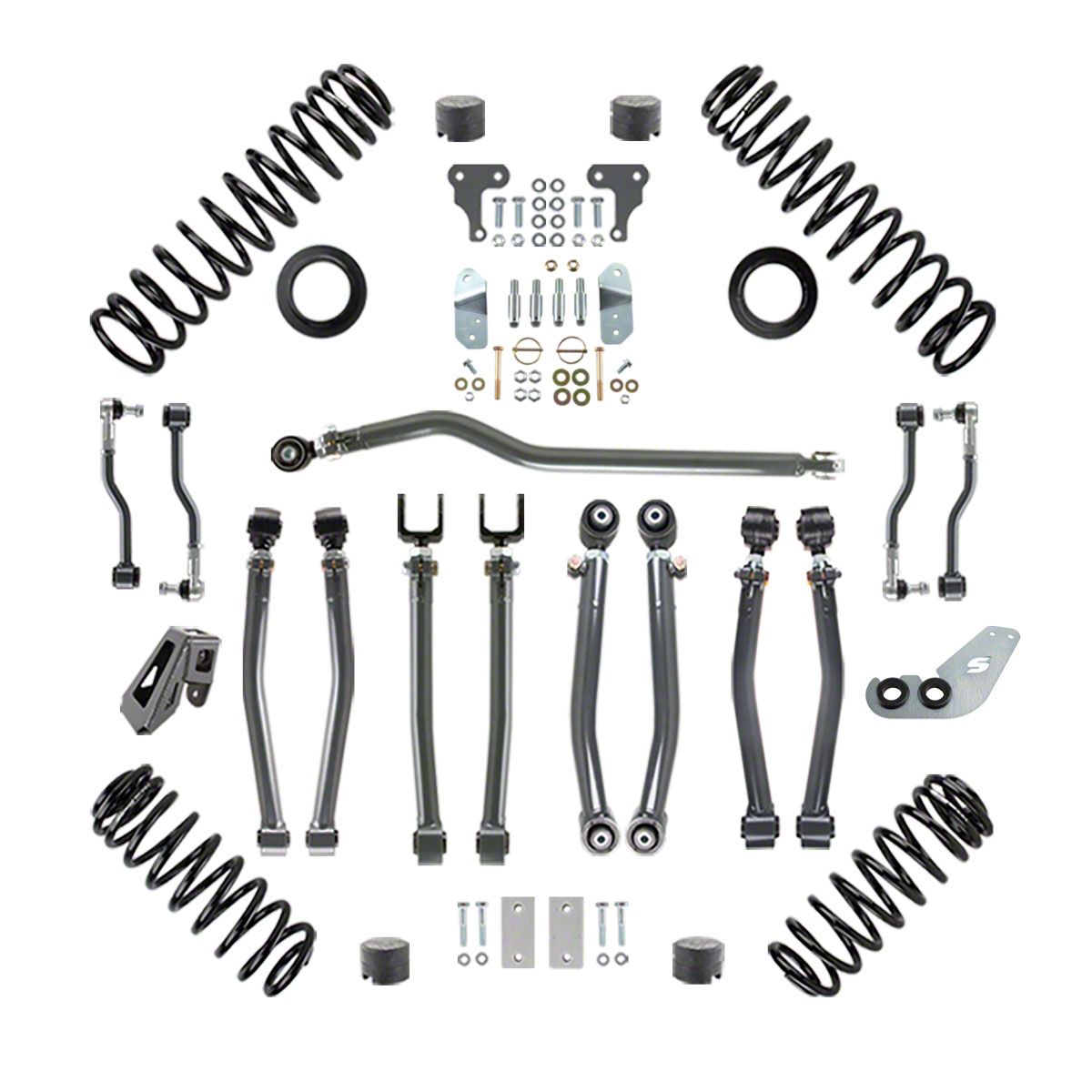 Durably Made and Matched Components. This suspension lift kit has a coil springs suspension system to allow the running of larger tires. It also has a front sway bar quick disconnect for a swift disconnection of the front sway bar if you want to go off-road. Other components include front and rear lift springs, bump stop spacer kit, adjustable front and rear upper and lower control arms, front and rear sway bar (links, drop brackets, links relocation brackets, and links with disconnects), rear track bar relocation bracket, rear parking brake cable bracket, and heavy-duty front adjustable track bar.