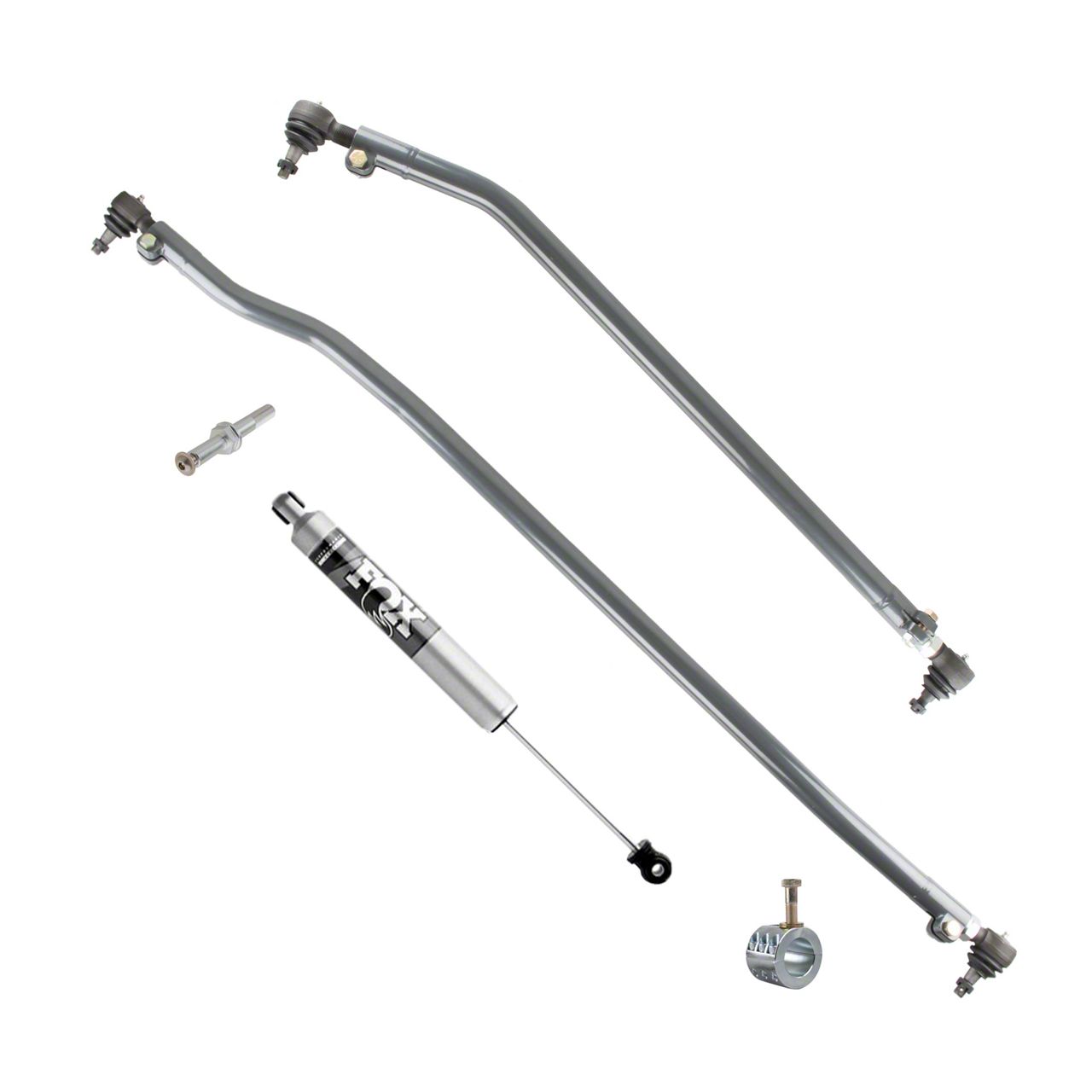 Installation. Designed as a direct replacement, the kit uses a double adjuster assembly for drag link and tie rod length adjustments without removal from the vehicle. It includes all necessary tie rod ends, adjuster sleeves, stabilizer hardware, and a FOX IFP stabilizer. Professional installation is recommended for precise alignment and setup, especially for vehicles undergoing high-steer conversions.