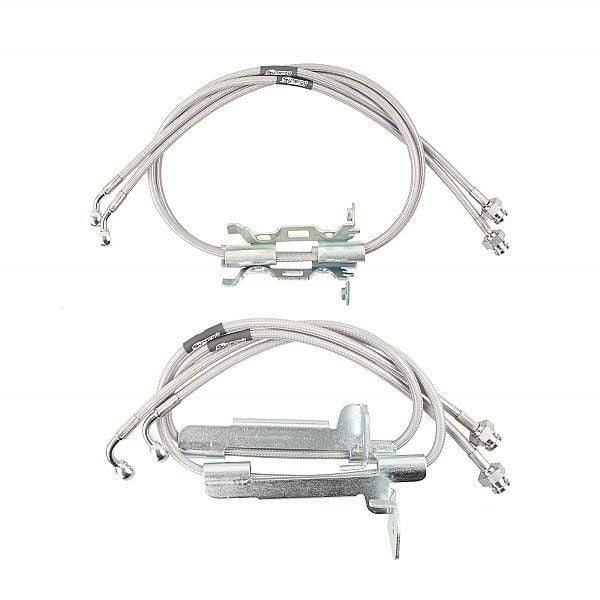 Stainless Braided Lines. The stainless braided design not only promises durability but also provides a stiffer pedal feel, enhancing your control during braking. Each set comes coupled with crush washers and mounting brackets, ensuring a seamless and secure installation.