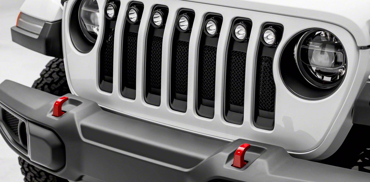 Stainless Steel Mesh. T-Rex grille insert features a 304 stainless steel mesh screen for ultimate impact and corrosion resistance. Its matte black finish will create an appealing contrast with light Jeep Gladiators and look impeccably classy with black vehicles. The (7) 2-Inch LED lights provide superior illumination in low-visibility conditions.