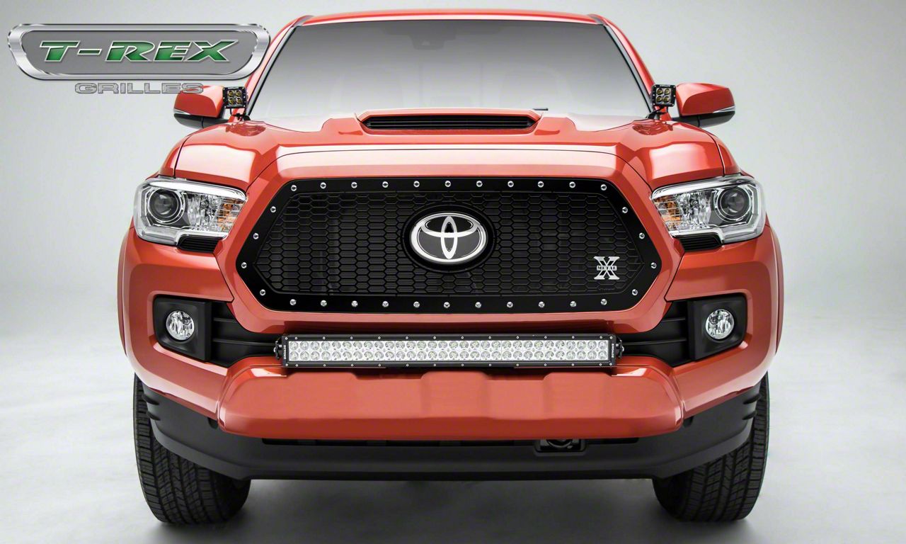 Laser-Cut Steel Construction. To withstand hits and impacts, as well as protect your Tacoma’s front end, this T-REX Laser X-Metal Series Upper Grille Insert is manufactured from laser-cut steel. The entire grille assembly is then coated with a sleek, black powder finish to protect it from harsh weather, rust, and corrosion.