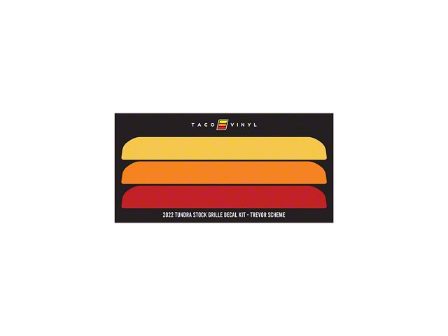 Custom Heritage Styling. The Taco Vinyl Grille Decal Kit enhances the front-end appearance of your vehicle by adding a bold and unique visual element. Designed with a retro-inspired heritage scheme, this decal kit provides a stylish way to make your Toyota Tundra stand out while maintaining a clean OEM+ aesthetic. It's ideal for truck owners looking to express individuality with minimal installation effort.