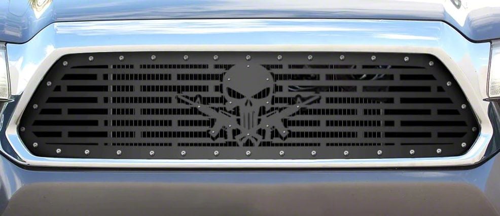 Bold and Unique Front-End Upgrade. Transform the appearance of your 2012-2015 Toyota Tacoma with this Upper Grille Insert featuring a distinctive Punisher AR-15 design. Combining style and durability, this grille insert adds a bold, aggressive look while offering reliable front-end protection.