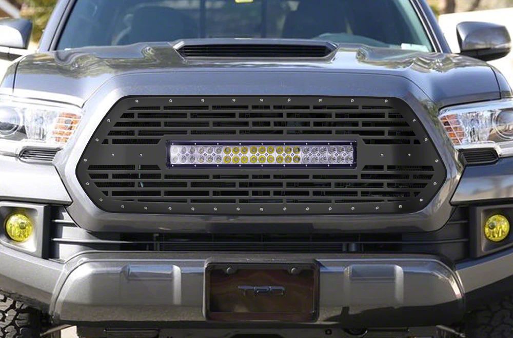 Application. This 1-Piece Steel Upper Grille Overlay with 22-inch LED Light Bar; Brick Pattern is designed to fit 2016-2017 Toyota Tacoma models.