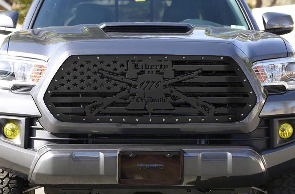 Patriotic Styling. Add patriotic styling to the front end of your Toyota Tacoma with a Liberty or Death Upper Grille Overlay. Featuring the Liberty Bell in front of the American flag, this satin black steel Grille Overlay will set your Tacoma apart from all the rest. Besides great looks, this Grille Overlay will provide extra protection from all types of trail hazards and road debris.