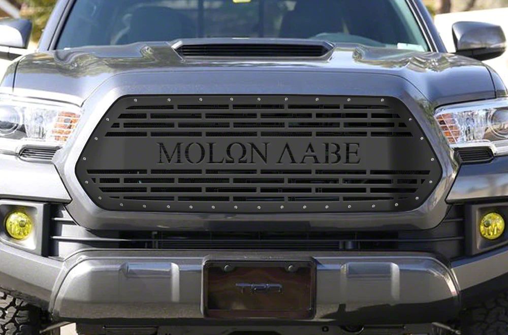 Exceptional Vehicle Front Replacement. The one-piece steel upper replacement grille with Molon Labe inscription provides a robust upgrade to the front fascia of your Toyota Tacoma. It replaces the factory grille with a custom design that enhances the truck's aggressive off-road look while maintaining the vehicle’s structural integrity and style.