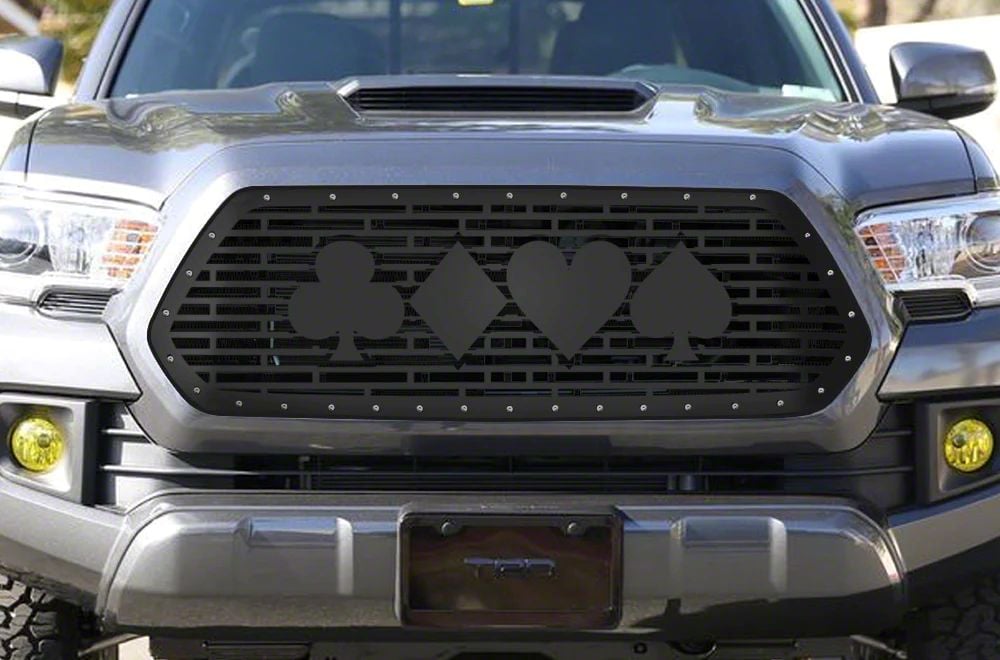 Custom Front-End Styling. The 1-Piece Steel Upper Replacement Grille adds a bold and unique look to your Tacoma with its eye-catching suit of cards cutout design. Perfect for enthusiasts who want to personalize their truck’s front fascia, this grille enhances visual appeal while allowing for compatibility with the factory emblem or a clean badge-free appearance.