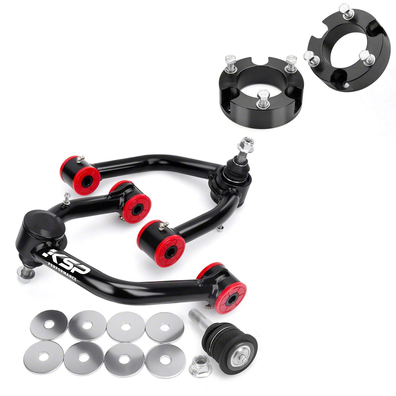 TOYOTA Upper Control Arm corrects the ball joint angle for 2"-4" front leveling kits. The Upper Control Arms feature a solid and Q235 Carbon Steel Plate with High-Strength Argon Arc Welding Process.TACOMA Upper Control Arm Constructed from 1.25" DOM Tubing and MIG Welded which will improve driving, handling characteristics and suspension articulation.KSP’s Upper Control Arms feature POM ball joints for a greater range of motion offering more wheel articulation than standard or OE replacements.Especially in CNC Machined provides bolder and safer pipe diameter.The KSP (UCA) -This special design with polyurethane bushings and zerk fittings for simple lubrication which can provide superior strength and durability.KSP Toyota 4 Runner 3" Front Leveling Lift Kits are Machine-manufactured precisely from 6061-T6 aircraft-grade aluminum billet to match you factory suspension.It will come to you complete with all the hardware and clear instructions. Can be installed in about 1 1/2- 2 hours and does not require any special tools.KSP Performance Leveling Lift Kits are CNC machined out of billet aluminum and then anodized black to match you factory suspension which better than power coated.The Anodized surface can provide additional resistance to corrosion and it can improve your Toyota Tacoma 4Runner FJ Cruiser lifted suspension travel and performance,Gives your truck a noticeably aggressiveKSP Performance's UCA with Lift Kits have a good quality, we can provide 100% satisfaction guarantee.