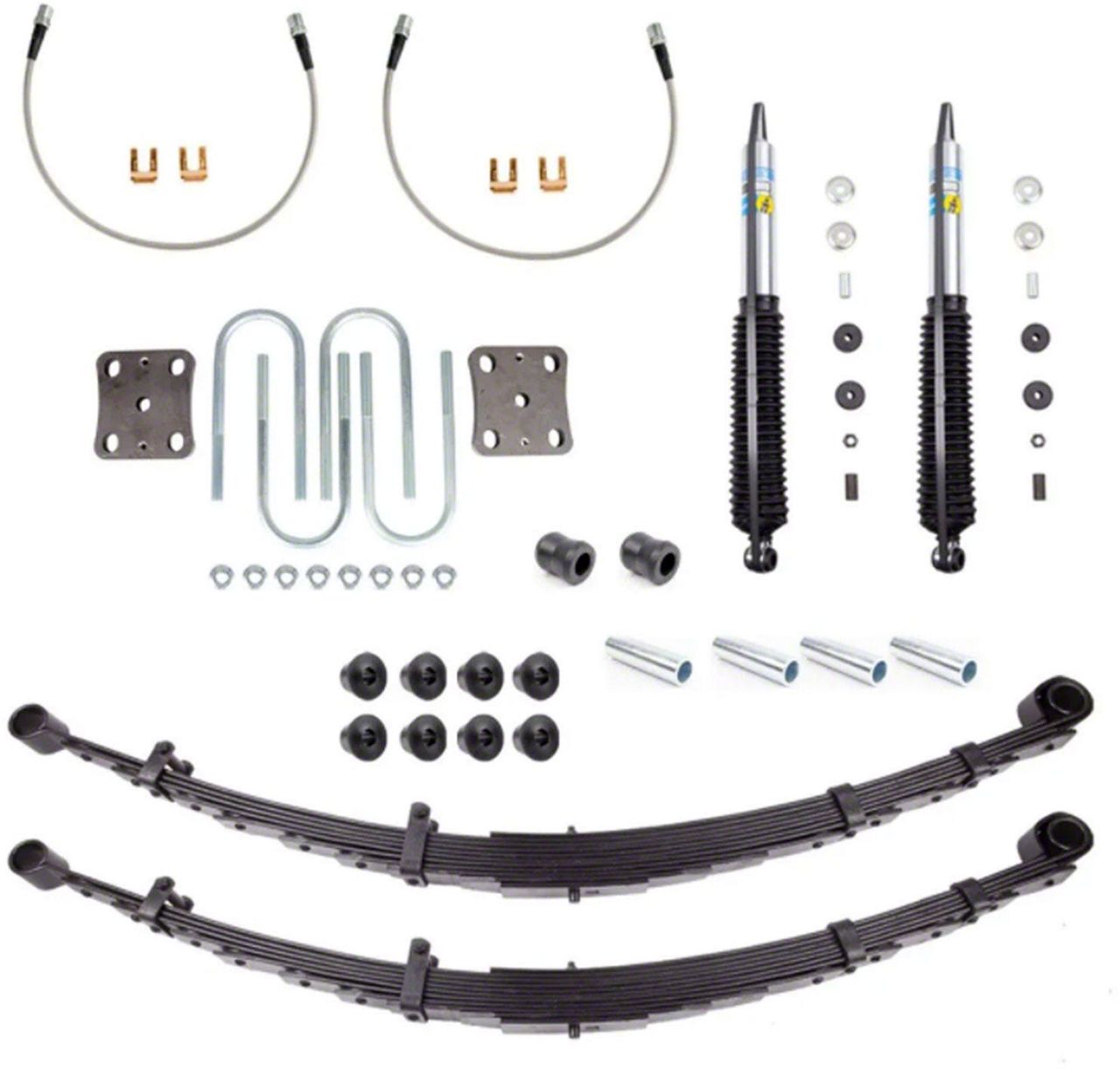 Construction and Appearance. This kit features Bilstein monotube shocks with gas pressure technology and a durable multi-layer zinc finish for corrosion resistance and longevity. The Expedition 2.0 multi-leaf springs deliver both strength and controlled flex. DOT-approved 24-inch braided steel brake lines are included, rated for lifts up to 4 inches, and rigorously tested to federal safety standards.