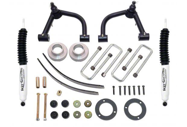 Construction and Appearance. This lift kit features durable upper control arms and strut spacers for the front lift and add-a-leafs with extended U-bolts for the rear. The components are built to withstand tough conditions while maintaining compatibility with stock front struts. The shocks and spacers have a rugged appearance to match the performance.