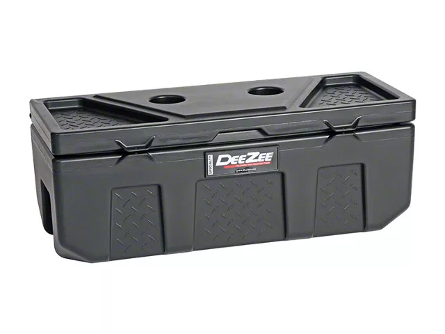 Poly Plastic. Proudly made in the USA, this storage chest is crafted from rigid poly plastic material, guaranteeing strength and reliability. The double-lid design allows for convenient access to your stored items. Molded cup holders add extra functionality to the chest, making it ideal for road trips and outdoor adventures.