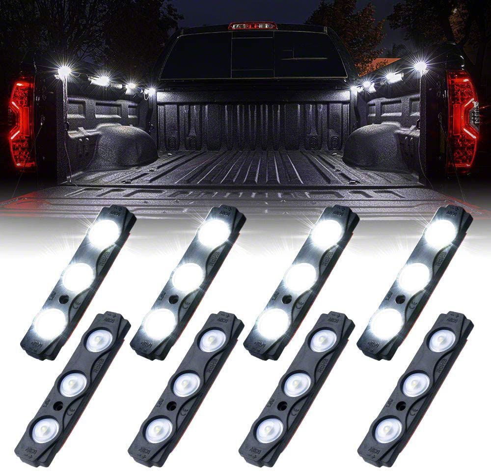 Clever Design. The 8-LED Rock Light Pod Truck Bed Lightning Kit; White is a clever design that provides brilliant illumination in a flip of a switch. Ideal to light up your truck’s interior footwells, truck bed, engine bay or underneath your vehicle, this innovative kit includes 2 separate strands of 4 light pods with 3 LEDs per pod for a superior performance.