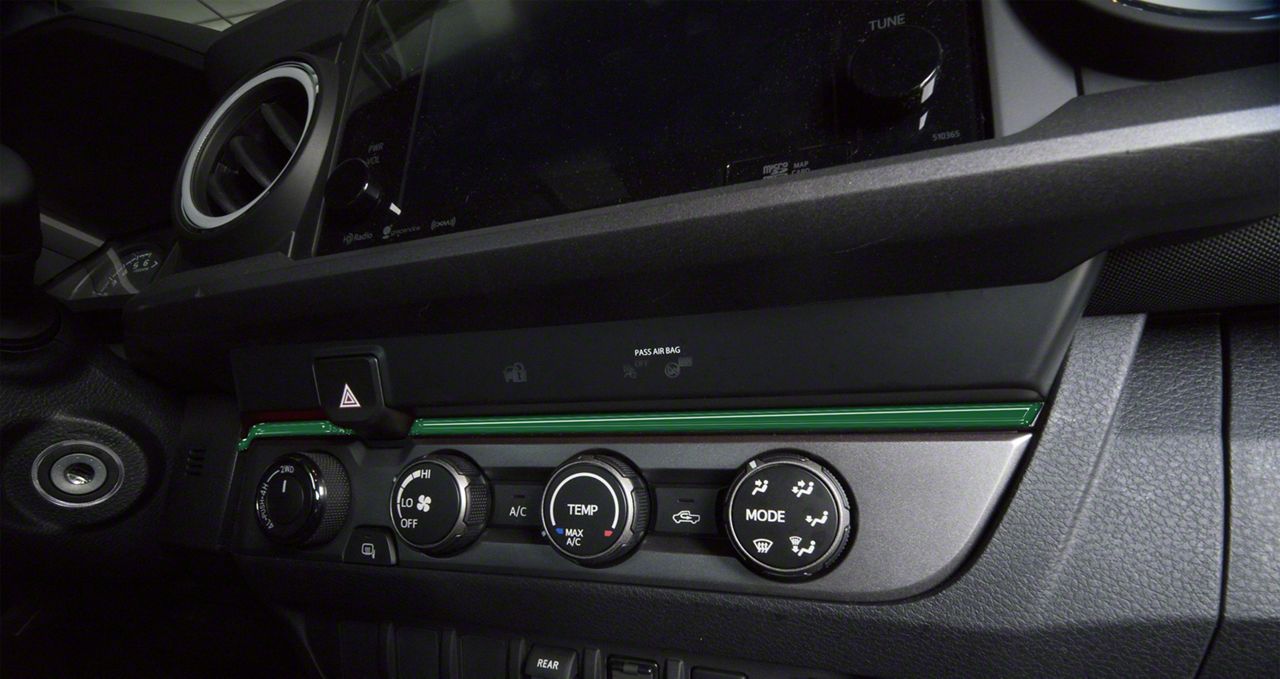Interior Styling. Add a new interior look to your Toyota Tacoma with this Above Climate Control Accent Trim Strip; Army Green. These 2 pieces give a cool style appearance and they are positioned above your climate controls.