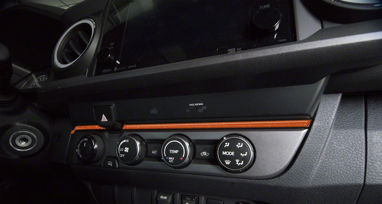 Interior Styling. Add a new interior look to your Toyota Tacoma with this Above Climate Control Accent Trim Strip; Inferno. These 2 pieces give a cool style appearance and they are positioned above your climate controls.