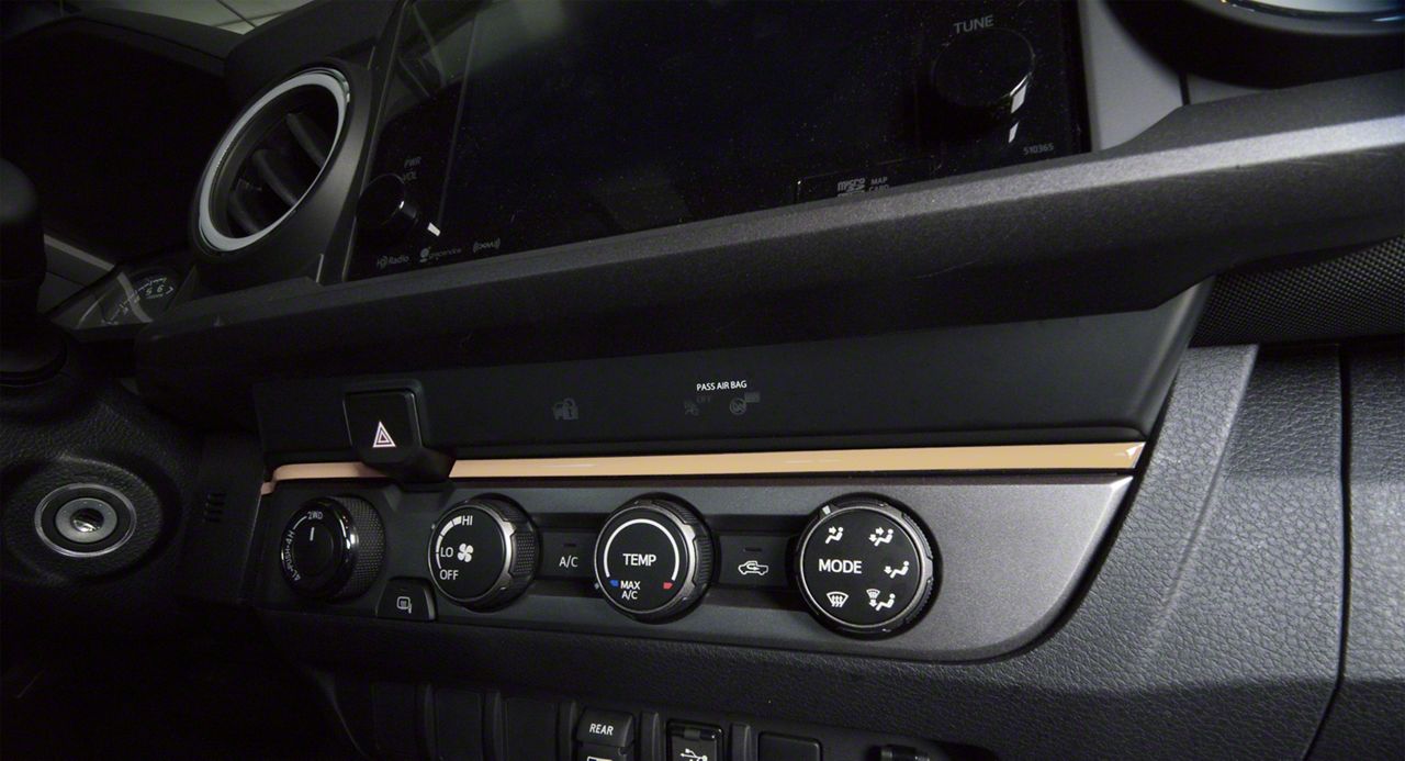 Interior Styling. Add a new interior look to your Toyota Tacoma with this Above Climate Control Accent Trim Strip; Quicksand Tan. These 2 pieces give a cool style appearance and they are positioned above your climate controls.