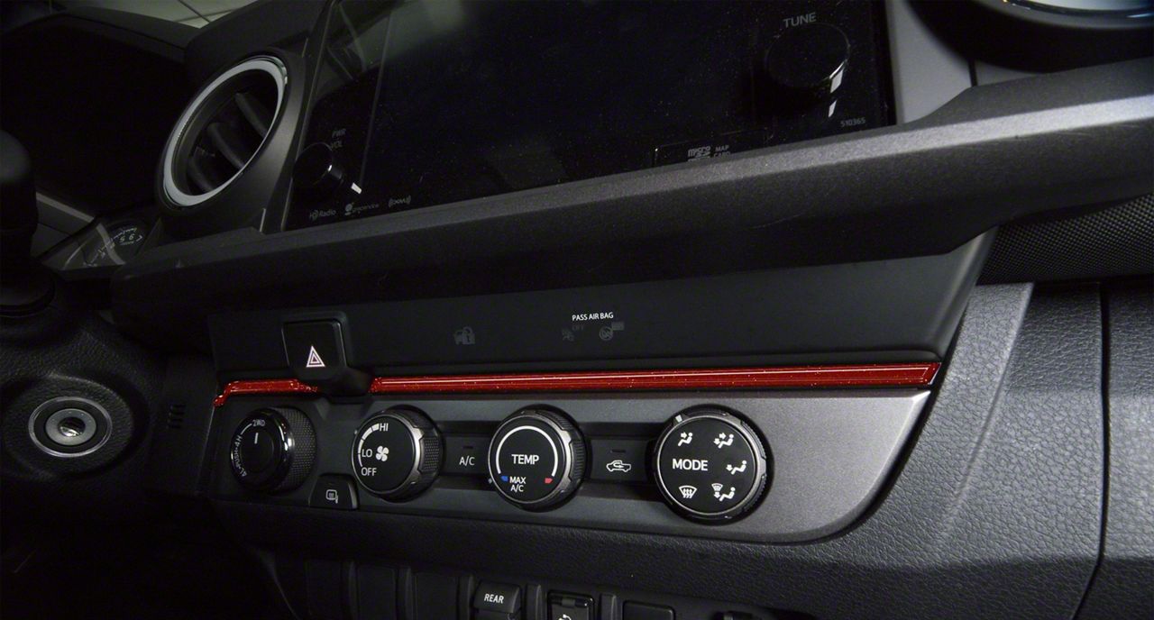 Interior Styling. Add a new interior look to your Toyota Tacoma with this Above Climate Control Accent Trim Strip; Ruby Red. These 2 pieces give a cool style appearance and they are positioned above your climate controls.