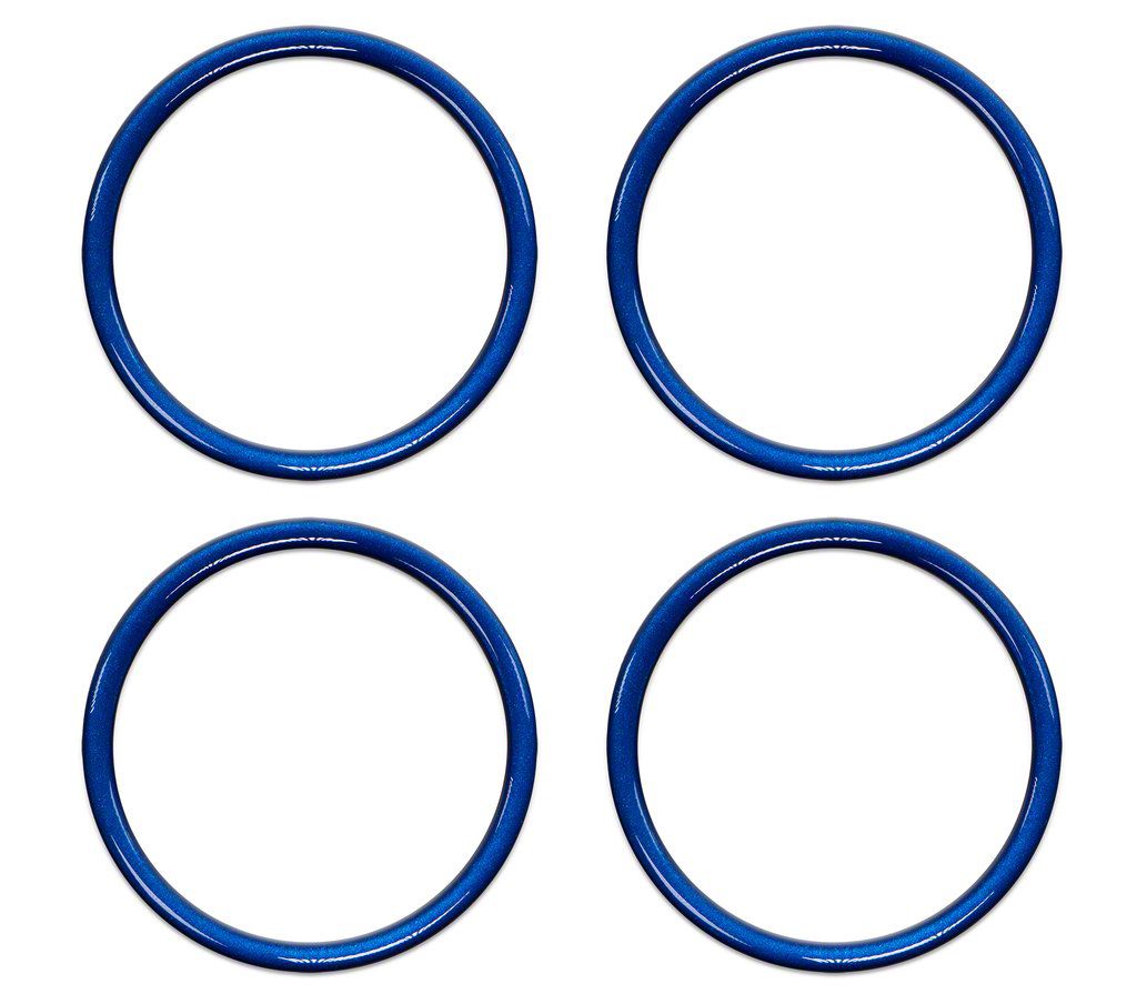 Construction and Appearance. These A/C Vent Ring Accents are made in the USA using a 3-layer process. The first layer is a UV-doming resin that gives a high-gloss, scratch-resistant finish. Layer 2 features substrates that lead to your color options. The third layer is the 3M automotive-grade tape that promotes the bond. These accents feature a blazing blue color.