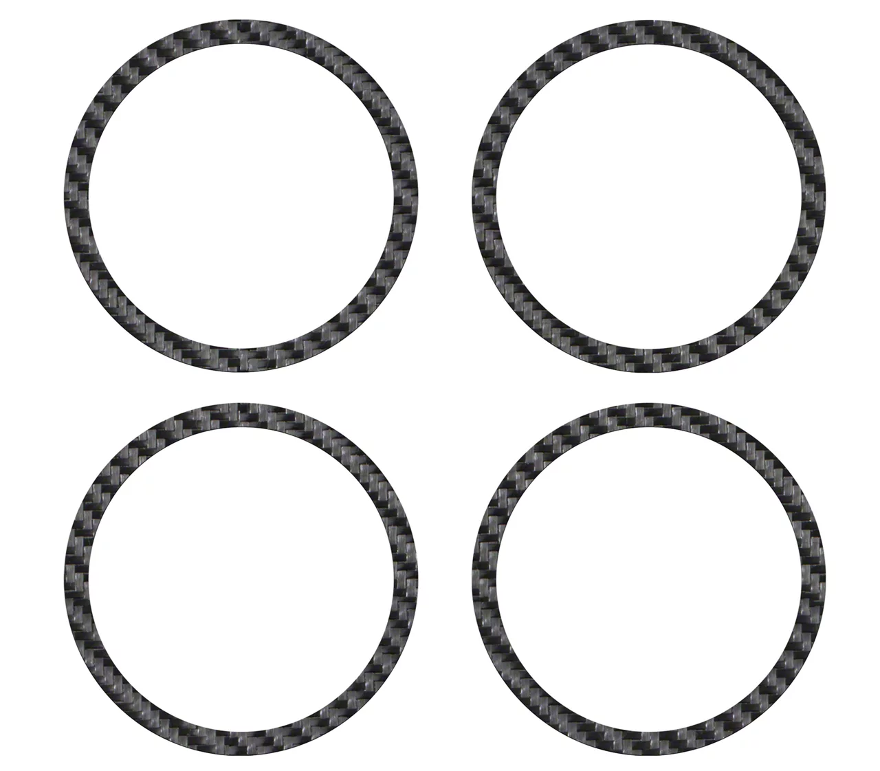 Construction and Appearance. These A/C Vent Ring Accents are made in the USA using a 3-layer process. The first layer is a UV-doming resin that gives a high-gloss, scratch-resistant finish. Layer 2 features substrates that lead to your color options. The third layer is the 3M automotive-grade tape that promotes the bond. These accents are raised 1 mm and feature a raw carbon fiber design.