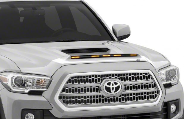 LED Running Lights. This Hood Protector also includes high mount amber LED running lights. These LED accent lights come with a wiring harness that simply splices into your Tacoma's existing factory headlight harness. The LEDs will then automatically activate in conjunction with your running lights. The eye-catching LEDs not only look great, but will also make your Tacoma more visible to other drivers at night and in poor weather conditions.