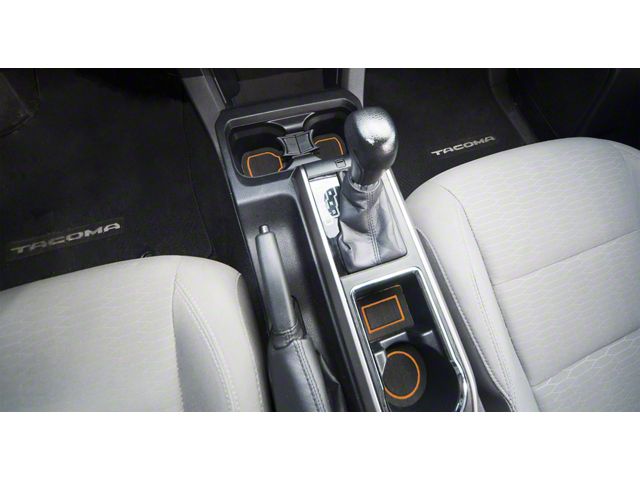 Striking Colors. Upgrade your Tacoma's interior functionality and style with these Center Console Cup Holder Inserts, perfectly engineered for models with automatic transmission. Featuring striking black and orange colors, these inserts add a touch of customization while maintaining a clean and organized console area. Designed for easy use with no modification needed, they fit seamlessly into your existing cup holders.