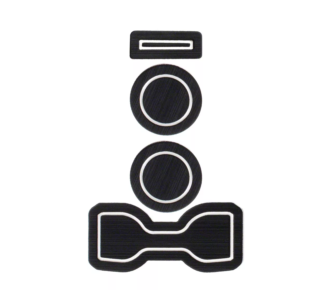 Construction and Appearance. Built using a durable, dual-layered material, these inserts are engineered for long-lasting use. The non-absorbent, non-skid surface ensures stability for your beverages while preventing spills and wear over time. Their sleek black/white design gives your console a fresh, distinctive look that complements the factory interior.