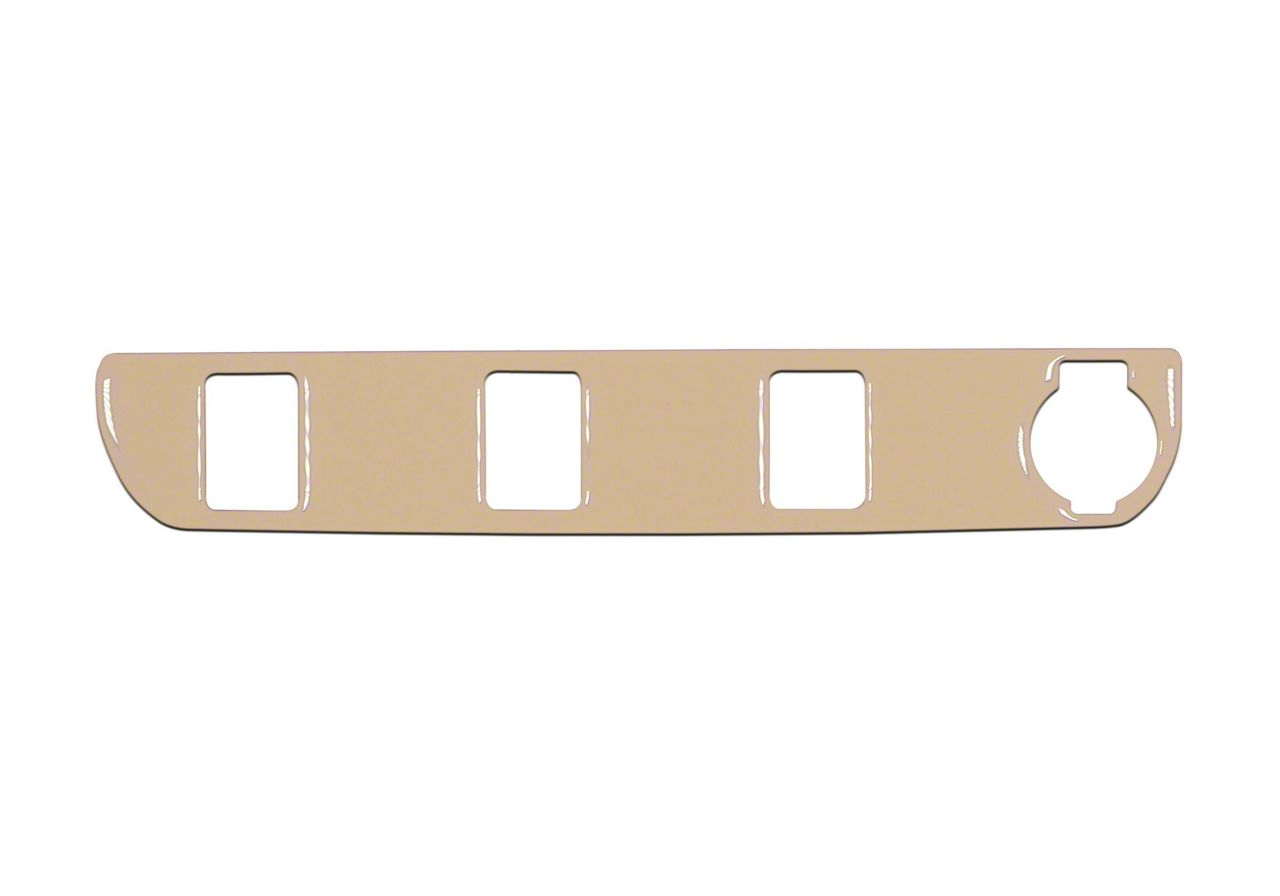 Construction and Appearance. This Center Dash 3-Switch Panel Accent Trim is made in the USA using a 3-layer process. The first layer is a UV-doming resin that gives a high-gloss, scratch-resistant finish. Layer 2 features substrates that lead to your color options. The third layer is the 3M automotive-grade tape that promotes the bond. This accent features a quicksand tan appearance.