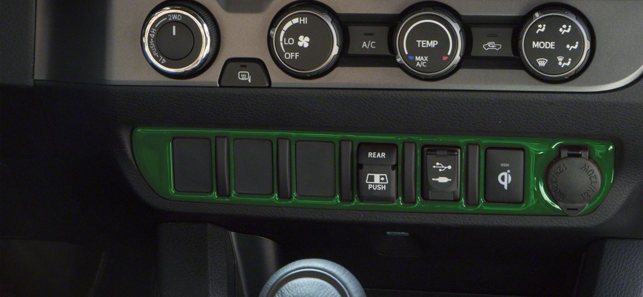 Interior Styling. Add a new interior look to your Toyota Tacoma with this Center Dash 6-Switch Panel Accent Trim; Army Green. This piece gives a cool style appearance and is positioned over the trim surrounding the center dash switches.