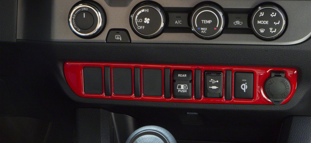 Interior Styling. Add a new interior look to your Toyota Tacoma with this Center Dash 6-Switch Panel Accent Trim; Gloss TRD Red. This piece gives a cool style appearance and is positioned over the trim surrounding the center dash switches.
