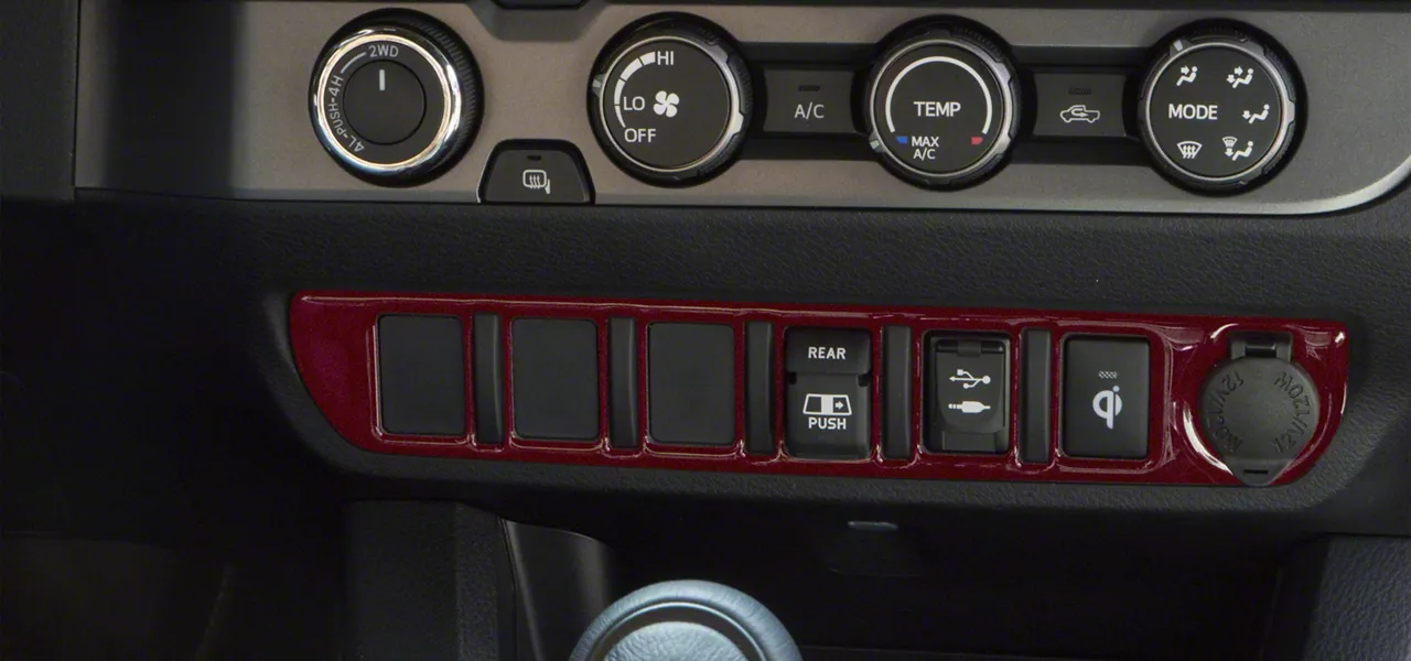 Interior Styling. Add a new interior look to your Toyota Tacoma with this Center Dash 6-Switch Panel Accent Trim; Ruby Red. This piece gives a cool style appearance and is positioned over the trim surrounding the center dash switches.