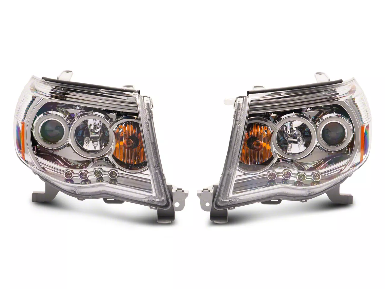 Classy Form and Practical Functionality. Take your Tacoma’s front lighting to the next level with the new Raxiom Super White LED Halo Projector Headlights; Chrome Housing; Clear Lens. These headlights combine a projector design and an intense CCFL halo to give your truck’s front end a more modern look. Moreover, these 2 design elements are not just for show, as these headlights offer superior visibility at night or during bad weather.